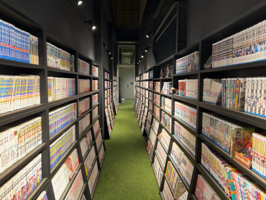 階段を下りるとまず目に入るのがずらりと並んだ漫画棚。蔵書はなんと1万冊以上!