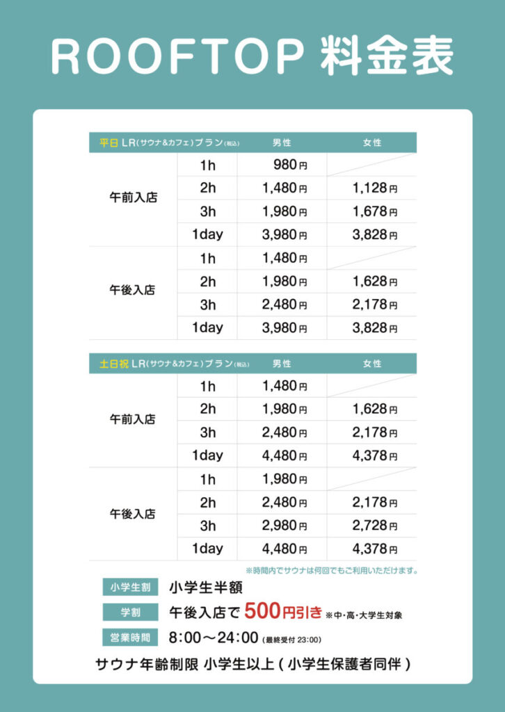 営業時間 | サウナ&スパ:8:00~24:00(最終受付23:00) カフェ&ダイニング:8:00~23:00 |